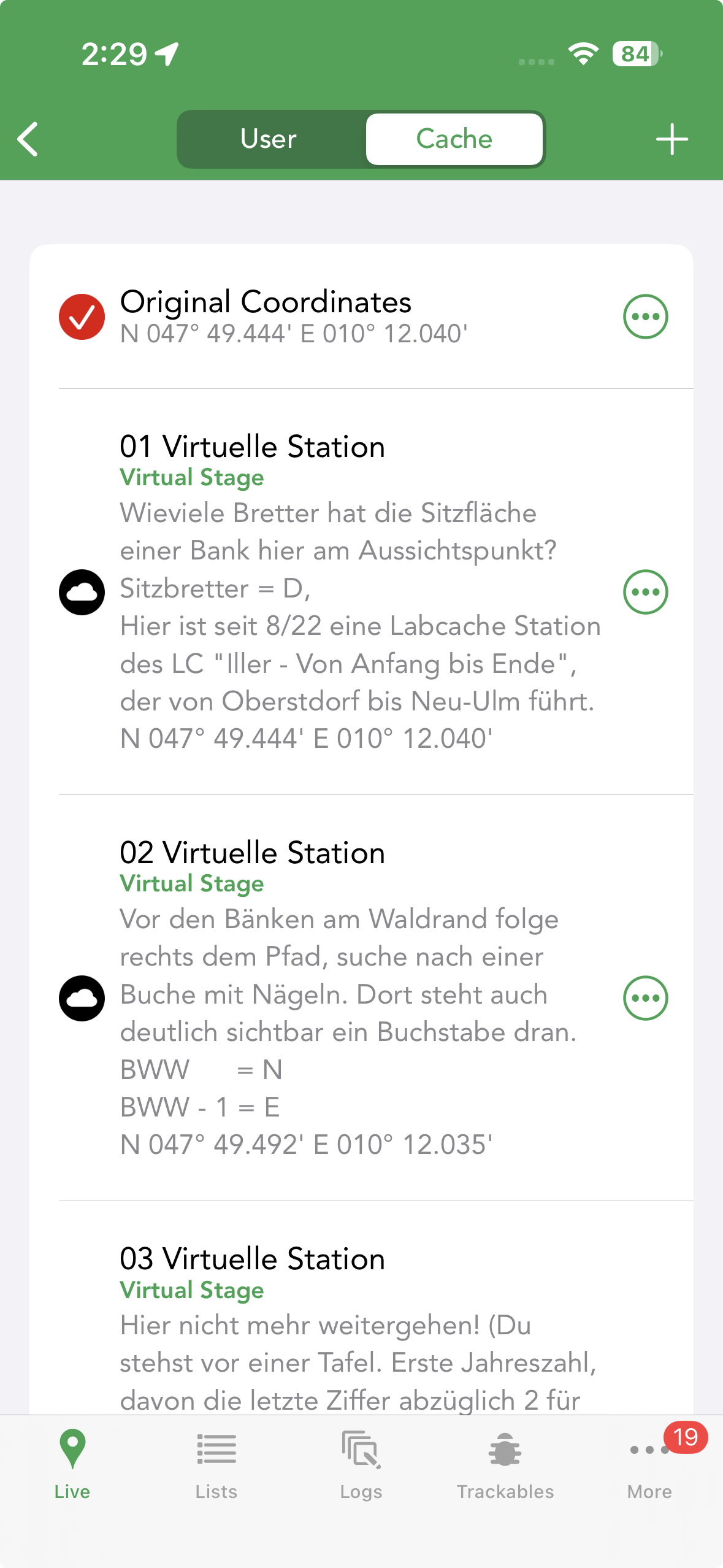 Sometimes when I am near one of that caches I'm checking for other caches around that cache. But then I want to see only caches which I haven't found before. Then it would be great when I could open the position of the cache from the offline list in the live tab using all filters which are set there. So I could check for unfound caches around quickly without using other offline lists or something like that.